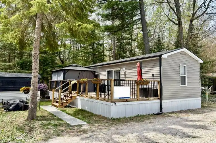 Enjoy breathtaking forest views and a short walk to the beach from this stunning seasonal retreat in the highly sought-after Countrylife Resort! Available for 7 months (April 28 November 15), this like-new 2023 Northlander offers a perfect blend of comfort and convenience. Step onto the spacious full deck, complete with a gazebo, projector, and screen ideal for outdoor movie nights. This prime location provides plenty of space, parking for two cars, and easy access to the Rec Centre, pools, and resort amenities. The beautifully landscaped, low-maintenance yard sits centrally located in the resort with views of the forest, creating a peaceful setting for relaxation. Inside, you will find a bright and airy 2-bedroom, 1-bathroom layout with ample space for family and friends. The primary bedroom features a cozy queen-size bed, while the fully furnished interior boasts central A/C and a well-insulated design for comfort throughout the season. Additional perks include a durable, low-maintenance exterior and a generous storage shed. Countrylife Resort offers an array of top-tier amenities, including pools, a splash pad, a clubhouse, a tennis court, playgrounds, mini golf, and private walking paths leading directly to the beach. This gated community ensures security and peace of mind. Well-maintained and move-in ready, this retreat is an absolute pleasure to show! 2025 seasonal site fees are $6,420 + HST, covering access to all amenities, gated car entry, and exclusive beach access path .Don’t miss your chance to own this incredible getaway!