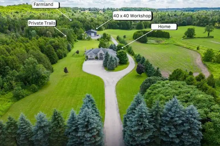 Welcome to your private estate on nearly 26 acres of peaceful countryside. This stunning custom bungalow offers over 4,000 sq. ft. of luxurious living space with thoughtful upgrades throughout. A gated entrance and long paved driveway lead to a beautifully landscaped setting featuring a saltwater inground pool, cascading waterfall, multiple walkouts, and expansive decks that embrace indoor-outdoor living. The main floor showcases vaulted ceilings, hardwood floors, a spacious living room with fireplace, and a gourmet eat-in kitchen with quartz counters and walkout to the deck. The primary suite is a true retreat with a spa-like ensuite, walk-in closet, and its own deck access. The walkout basement offers incredible flexibility with two more bedrooms, a full washroom, a gym room, a bar, games/rec areas, a large office, and a second living area ideal for multigenerational living or a private apartment setup. A major highlight is the 40×40 heated workshop with 14 ceilings, two roll-up doors, 3-piece bathroom, and its own separate paved driveway and gravel pad perfect for contractors, hobbyists, mechanics, or storage income potential. Outdoor lovers will enjoy private trails for hiking, biking, ATVs, horses, or snowmobiles. The rear farmland and mature trees complete this serene rural lifestyle.**EXTRAS** Generac Generator, Fenced Salt Water Pool, Fenced Dog Run, Fire Pit, Long Paved Driveway, Hot Water Tank and Water Softener are owned.
