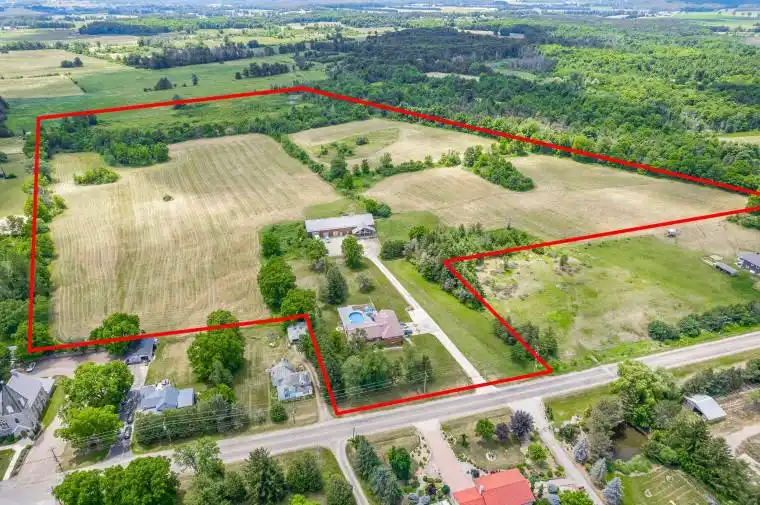 The TOTAL PACKAGE!!! ~6000 sq ft outbuilding & a ~2200 sq ft bungalow, with a grade level walk-out basement, all situated on ~42 picturesque acres. The ~6000 sq ft outbuilding features 3PHASE (600 volts 500 amp) electrical service. In floor heating in the in-law suite & middle bay only. 3 bay doors, office & 3pce bath. PLUS there is a 1 bedroom loft in-law suit. Bright sun filled open concept floor plan. Living room with cozy gas fireplace. Updated kitchen with a huge island with breakfast bar, quartz counters, 36 Wolf stove, stainless steel fridge/freezer & Miele dishwasher. Spacious bedroom overlooking the main floor with wood ceilings. Combination walk-in closet, laundry with full size washer/dryer & 3pce bath. For the INVESTOR there’s a potential for great MONEY MAKING OPPORTUNITIES!!! Sprawling ~2200 sq ft 4 bedroom, 3 bath brick home offers a large living room with double sided wood burning fireplace. Eat-in kitchen with a walk-out to a composite deck & above ground pool. Full basement, partially finished with a grade level walk-out. Separate workshop/hobby room. New 125′ deep well in 2020. 42 acres with ~30 acres workable. For the owner, you have your own gym (47′ X 38′). Close to a full size indoor Pickleball Court, Basketball half court, ball hockey area or Yoga Studio. Other options: pottery studio, arts & crafts, storage for vintage & classic cars or operate a small home based business.