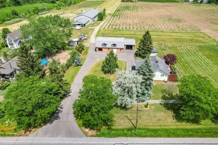 This 21+ acre parcel has much to offer. Located on Niagara’s prestigious wine route just minutes from the new hospital, QEW and all amenities. It’s been a working horse farm with 6 paddocks, original 45′ x 25’hip roof barn with 3 stalls, a 1500 bale hay mow, sand ring and pasture. Attached 30′ x 17′ full on mechanics shop with hoist, overhead door, wood stove and propane heat. 40′ x 20′ storage shop. Separate hydro meters for the house and barn. Second 40′ x 40′ 5 stall barn with tack room, wash stall, hay storage, covered 40′ x 12′ concrete landing and attached 135′ x 60′ indoor arena with 2-16′ overhead doors all built in 2006. These solid outbuildings could be converted to many endless uses. North end of property has a small creek, woods and overgrown trails housing all walks of wildlife from deer to turkeys. The modest bungalow is spotless and totally redone in 1992. Featuring one large master with 4 piece ensuite privileges, main floor laundry room with patio doors to L-shaped wood decking and fenced yard. Open kitchen, dining and vaulted ceiling living room. Full basement with 2nd and 3rd bedroom potential. RI bath, CA, CV, natural gas furnace, new Generac. The owners have retired and are offering this great property to a buyer who appreciates all it’s worth. Present owners never registered the property through the OFA as a working farm, by doing so, the new owners could reduce property taxes drastically.