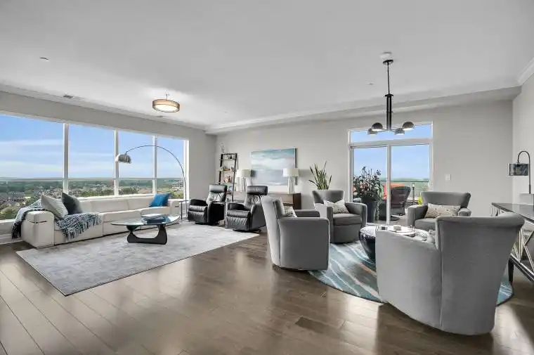 Welcome to this exquisite penthouse in the heart of Sunningdale, a rare offering in one of the London’s most prestigious high-rise buildings. Spanning 2,140 sq. ft., this 2-bedroom + den residence boasts soaring ceilings, a formal dining room, and a bright, open-concept layout perfect for both everyday living and upscale entertaining. The spacious great room features a fireplace and seamlessly connects to the gourmet kitchen, complete with an island, stone countertops, and premium finishes. The luxurious primary suite includes a generous walk-in closet and a spa-inspired ensuite bath. Enjoy breathtaking, unobstructed North and East views from your expansive outdoor living spaces including a covered balcony (90 sq. ft) and a private 486 sq. ft. terrace ideal for entertaining or relaxing in total privacy. The building offers a full suite of luxury amenities, including an indoor pool, fitness centre, golf simulator, theatre room, and a residents kitchen and formal dining room for hosting private events. Additional highlights include two underground parking spaces (#54 and #33) and three storage lockers (#132, #141, and #153). This is a rare opportunity to own a signature penthouse with unmatched outdoor space and five-star amenities in one of Londons most desirable communities.