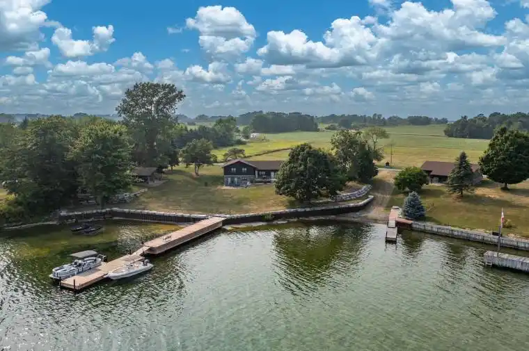 Rare opportunity to own 2 separate but adjoined waterfront properties, offering a combined 3.6 acres and 312 feet of clean, sheltered shoreline on the South/Eastern end of Wolfe Island in the heart of the Thousand Islands. Currently a perfect single family compound, two deeds allow the option of a guest house if desired. 199 Leone’s Cove Lane is a fabulous turnkey, recently constructed, split level home. The main level’s great layout offers open concept kitchen and dining, electric fireplace, and patio doors opening onto a spectacular river view deck. A walk through pantry and custom bar lead to a 3-piece bathroom. The upper level has three bedrooms and full bath, while the lower level has a rec room with walk out to patio doors, laundry/mechanical room and an additional bedroom. Outside, over 2 acres of landscaped and manicured grounds provide ample space to enjoy more than 220 feet of natural flat rock shore. The property boasts new steel and stone break walls and ample floating and fixed dockage, perfect for swimming, fishing, kayaking, and boating. A fantastic garage (22×19) with pine board and batten interior with pot lighting provides another cozy indoor space. There is a lovely outdoor pavilion built for parties and entertaining that overlooks ships navigating the St. Lawrence River to and from Lake Ontario.213 Leone’s Cove Lane, the waterfront neighbouring property, has a 38×35 foot barn adorned from floor to ceiling with knotty pine, patio doors leading out to a stone landing, and quality lighting. All buildings for both properties have beautifully coordinated stone and siding. An additional 1.2 acres leads to 91 feet of clean shoreline, with your own boat launch and floating dock. Truly a once-in-a-lifetime opportunity. It’s time to pack your bags, grab your friends and family and start making wonderful memories. Be one of the lucky few to know the joys of island life.