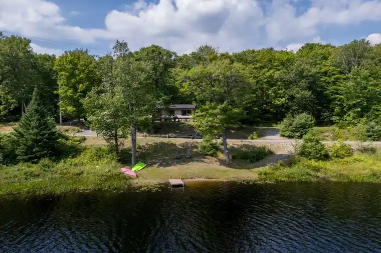 Live year-round with breathtaking views you’ll never get tired of! Welcome to your private piece of paradise on tranquil Frau Lake, a no-motor lake perfect for peaceful paddling, fishing, and swimming. This meticulously updated 3-bedroom, 1-bath home offers stunning lake & forest views from every room and sits on 0.9 acres with 189 feet of sandy waterfront. Dive off the dock or enjoy the gradual entry, perfect for kids. The open-concept living space features soaring beamed ceilings, a cozy family room, and a newly updated eat-in kitchen – all designed for everyday living. Step out to the front porch and grill dinner while enjoying the custom live-edge bar overlooking the water. Your dreamy primary suite includes a bay window facing the lake and a walkout to the backyard, offering quick access to stargazing & sunsets. Major updates offer peace of mind including new roof (2025), septic (2021), electrical (2021), bathroom renovation (2022), primary bedroom renovation (2023), garage door (2023), kitchen updates (2025), and eaves/fascia/soffits (2025) and more. Outside, explore a beautifully landscaped yard with a stone path leading to a detached workshop with it’s own panel, ideal for projects & storage, plus an attached garage and two driveways for ample parking. Enjoy evenings around the firepit, under the stars, take in the stunning maple colours in the fall and snow covered pines in the winter. Located just 8 minutes from Hwy 11 and downtown Bracebridge’s charming shops, restaurants, and waterfalls. Bonus: fantastic neighbours- something you truly can’t put a price on. Come experience the beautiful blend of comfort, community and nature that you won’t find anywhere else.