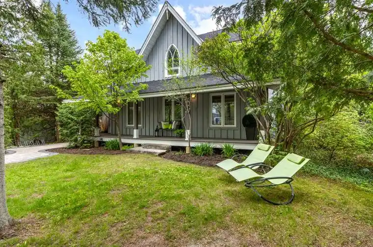 GORGEOUS WINTER CHALET – This stunning 4 bedroom country style chalet with covered front porch is in a PRIME location. Just steps away from Blue Mountain Resort’s ski lifts and Blue Mountain Village, Ontario’s most popular four season resort. Modern open concept with fully equipped gourmet kitchen including outdoor gas BBQ to make gourmet meals. Enjoy the panoramic views and relax on the elevated deck or enjoy the large open backyard and green space. Spend time with friends in the 8 person outdoor hot tub, or unwind in the spa like main bathroom with Jacuzzi tub, heated floors, and separate shower. Kids can hang out downstairs playing Foosball, pinball, darts or watching their favorite shows while parents cook up a tasty meal in the well-appointed kitchen upstairs under the skylights . Loaded with features including; new roof in 2018, new stamped concrete driveway and back patio in 2019, oversized Super Fan in living room, stainless steel appliances, French door bottom freezer fridge, new six burner gas/electric stove (2021) in island, garburator, ceiling mounted vent hood, wine fridge, quartz stone counter tops, new flooring in basement, jetted bathtub and heated floors in bathrooms, alarm system and keypad entry. This warm country chalet is just waiting for the next family to enjoy Blue Mountain living!