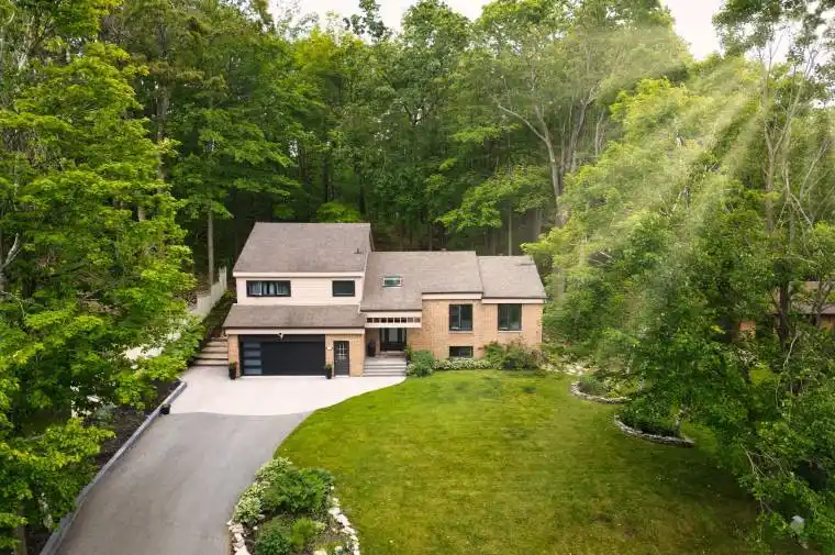 Welcome to your forever home in prestigious Midhurst, where Character, Charm, Modern Elegance meet. Nestled on one of the areas most scenic streets, this stunning 4 Bedrooms, 3 Bathrooms, Finished Lower Level with Separate Entrance – multi-split home sits on an expansive 100 x 260 ft lot with lush gardens, mature trees, and no rear neighbours ultimate privacy and tranquility – perfect for a zip line and outside living. Step inside to soaring 14-ft vaulted ceilings and a dramatic floor-to-ceiling double-sided gas fireplace, seamlessly connecting the brand-new chefs kitchen, open-concept dining area, and sophisticated formal living room. Versatile Layout: 3 spacious bedrooms upstairs plus a main-floor bedroom or office perfect for professionals, families, or multi-generational living. Finished Lower Level: Private entrance from the garage offers flexibility for guests, teens, or future in-law suite. Your Own Private Backyard Paradise – This property has it all: Hidden paths winding through your backyard; Wildflowers in spring trilliums and forget-me-nots; Space to build expansive vegetable & flower gardens; Perfect spots for a fire pit & cozy seating areas; Even room to set up a zip line for the kids! Imagine entertaining on your deck, watching the kids explore, gardening in the morning sun, or enjoying quiet walks down your own wooded path. This is more than a backyard its an outdoor lifestyle. Major Upgrades Include: All new Kempenfelt windows (transferable warranty); Stunning chefs kitchen with gas stove & 7-ft island; Two beautifully renovated bathrooms; New poured concrete garage floor; New front & garage doors; Extensive landscaping & retaining walls; Water softener system; Option to include furniture & all lawn/home care equipment. Enjoy peace of mind with all big-ticket items complete & a low-maintenance yard, giving you more time for what matters most. Top-rated school district, minutes to Barrie, Hwy 400 & 11, skiing, hiking, golf, boating, shopping & dining