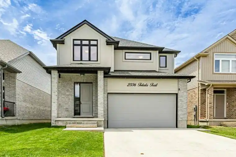 Welcome to 2336 Tokala Trail a beautifully designed 4 bedroom, 3.5 bathroom home in one of London’s most sought-after neighbourhoods in the North West end of the city. Enjoy high-end finishes throughout, including engineered hardwood flooring, quartz countertops and a kitchen with a 12 foot island and is magazine-worthy, thoughtfully designed with both function and beauty in mind. Host family or a dinner party with your formal dining room with carefully designed accent walls adding a classy look to the room. Entertain or relax in the great room with a sleek electric fireplace and custom built-ins that keep the minimalist look. Your upper level features 2 spacious ensuites plus a third cheater ensuite, including a luxurious primary retreat with a large walk-in closet, this home offers comfort and style at every turn. Step outside to a fully fenced backyard with a covered deck, perfect for summer BBQs, entertaining, or even installing your dream inground pool. Ideally located near Hyde Park and Masonville for shopping, great schools, golf, scenic trails, and all amenities. This one truly checks all the boxes!