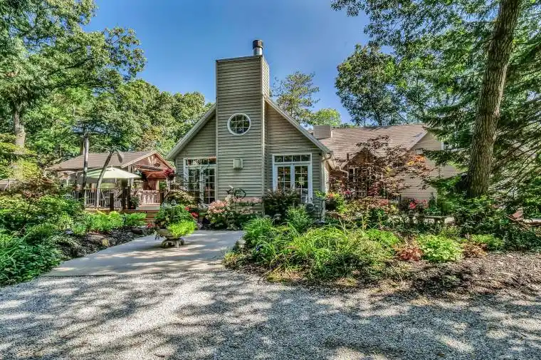Relax and unwind at your private oasis nestled in the woods! This stunning home is situated on over 3 acres of lush green forestry in desirable Port Franks. Drive up one of the two private winding paths to this updated 1.5 storey home boasting all the amenities for everyday life and play! Enter through the front door into the grand and spacious foyer, through to the sprawling open concept main level featuring great room with hardwood floors, vaulted ceilings, fireplace with stone surround, skylights and access to the large rear deck; updated kitchen loaded with storage, wet bar, granite counter tops, large island with breakfast bar, and direct access to side deck perfect for a serene dinner in the treetops. Lovely main floor primary suite with walk in- closet and updated ensuite including double sinks, granite countertops and tiled shower with glass enclosure. The convenience of mudroom, laundry and 4-piece bathroom complete the main level. Travel up one of the two staircases to the additional 2 bedrooms and generous den/recreation room with fireplace. You can’t miss the central outdoor entertainment spot! Boasting large timber framed gazebo (2018) with wet bar, outdoor kitchen, beer taps, ice maker, multiple fridges, TVs, wood burning fireplace, hot tub and sauna you have everything you need to entertain your friends and family all day and night long! Wander down the path to the beautiful 1 bedroom guest house with living room, kitchenette, bathroom, laundry, covered deck, fire pit and parking- the perfect private place for your guests to unwind or to rent out for additional income. Down the path there are 3 storage sheds, space to park a camper, and potentially sever lots. The grand finale is the huge 40’x40′ 4-car detached heated garage with 2-piece bathroom (separate septic), 2x30amp service for campers, and 14’x14′ garage door perfect to park all of the toys you’ll want for exploring beautiful Lake Huron! Steps to beach, community centre, trails and more!