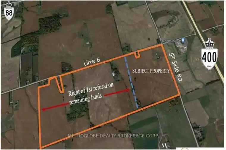An extraordinary chance to acquire a legacy property in Bond Head. Spanning approx. 99.11 acres at the corner of 5th Sideroad and Line 6, this original family-held farm is a rare acquisition of scale and character, the kind that seldom becomes available. It offers both the presence of a landmark holding today and the promise of significant future opportunity as the area continues to evolve.The lands are free of Greenbelt restrictions, with only a small conservation portion at the rear, leaving nearly the entire acreage usable. Suitable for an estate residence, equestrian retreat, or simply as a strategic long-term investment, the property is also surrounded by major developers. Across the road, designated employment lands are now undergoing servicing, underscoring the future development horizon.The possibilities are further strengthened by a remarkable 25-year first right of refusal on approx. 201 adjoining acres, offering a rare pathway to expand and secure an even greater presence in the area. Attractive seller take-back mortgage options are available, making this both a distinctive acquisition and a forward-looking investment. Residence and lands are tenanted. Showings by appointment only. Buyer to verify all information and conduct their own due diligence.