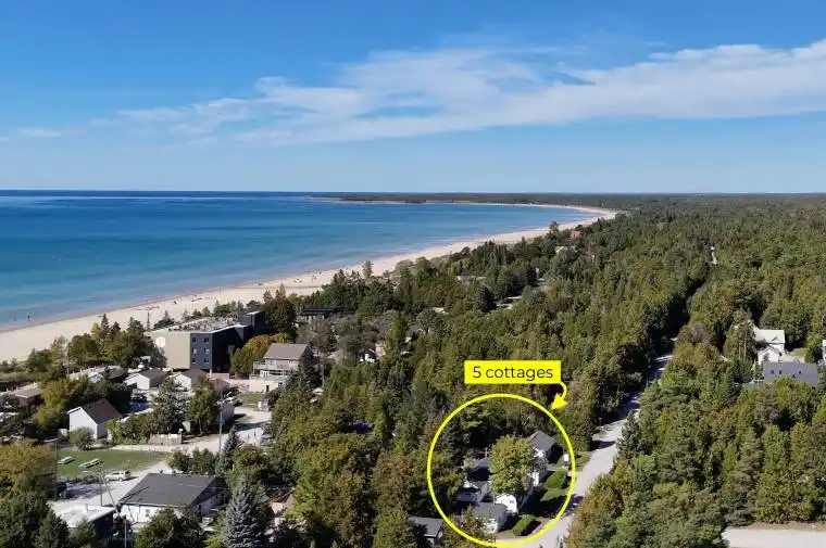 INCOME & LIFESTYLE OPPORTUNITY STEPS TO THE BEACH! Ideally located just a short walk from the sandy shoreline, this property includes five, 2-bedroom cottages, with one fully winterized for year-round living or rental potential. Each cottage features a living area, fully equipped kitchen, and bathroom – four cottages with 3-piece baths and the winterized cottage with a 4-piece bath along with a picnic table and BBQ, providing guests with everything needed for a comfortable and convenient stay. With a prime location, guests can park once and walk everywhere to the beach, shops, restaurants, cafés, and local attractions making it an easy, stress-free getaway. Live year-round in the winterized cottage while renting out the others seasonally. Continue operating as a turn-key rental business with established operations. Transform into a private family compound or multi-generational retreat steps from the water. The sale includes the business name, website, and almost all contents, plus the potential benefit of a long-standing customer base with repeat guests and advanced bookings already in place. A rare opportunity to combine lifestyle and income in a highly sought-after destination, all just steps from the shoreline in vibrant Sauble Beach.