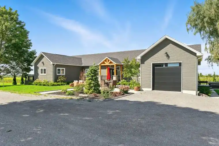 Welcome to this custom-built luxury bungalow on 1.54 acres of private countryside, offering modern comfort with timeless rural charm. A tree-lined driveway leads to beautifully landscaped grounds, a welcoming front porch, & multiple outdoor living spaces, including a raised deck & spacious patio for entertaining. The main level of this home is thoughtfully designed to combine everyday functionality with elegant style. A welcoming foyer with a double closet leads into the open-concept living spaces, where soaring ceilings with wood beams, expansive windows, & a striking fireplace create a bright & inviting atmosphere. The chefs kitchen is a true highlight, featuring high-end appliances, custom cabinetry, a large centre island, & a walkout to the deck. Seamlessly connected, the dining area & living room provide an ideal setting for gatherings, with natural light flooding the space from every angle. The primary retreat offers built-in cabinetry, a luxurious 5-piece ensuite with soaker tub & glass shower, & private access to the deck. A second bedroom, currently staged as a home office, adds convenience for guests. Completing the main floor is a well-equipped laundry & mudroom with direct access to the attached garage. The fully finished lower level extends the living space beautifully. A wide staircase with glass railing opens to the rec room, complete with a sleek wet bar, custom built-in shelving, & a cozy fireplace. A glass-enclosed gym provides a dedicated space for fitness while maintaining an open, modern feel. Two generously sized bedrooms, each with large above-grade windows, are complemented by a stylish 4-piece bathroom. The lower level offers the ideal blend of relaxation, recreation, & practicality, while also housing a utility room for added convenience. With an attached garage plus a detached workshop, this property is ideal for both relaxation & practicality, all while surrounded by sweeping farmland views & just minutes from nearby amenities.