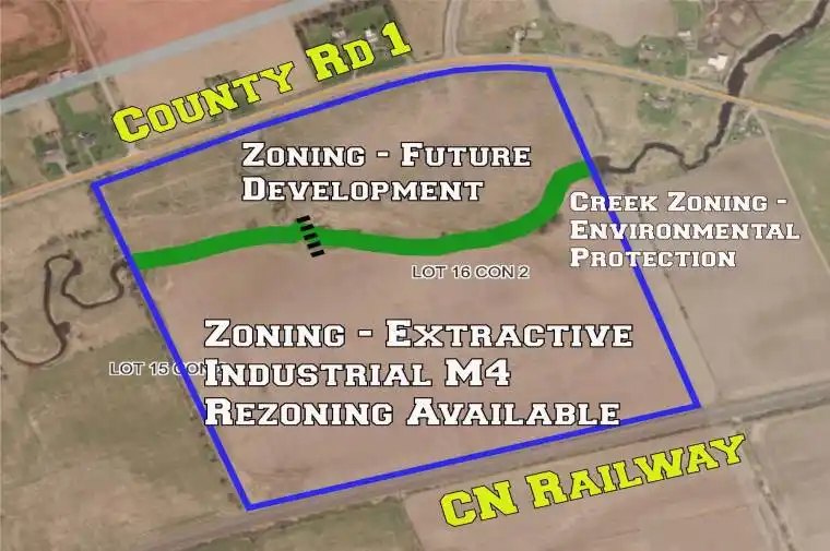 What a great opportunity! Zoned future development and M4 Extractive Industrial, the property is just over 88 acres and has a beautiful creek running through it, it has large deposit of clay on the back part of the property that could be sold before development. Being situated on County Road 1, just across from the end of Jim Kimmett Blvd. the property would be great for a housing development or commercial establishment.