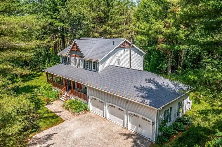 Located in the small, sought-after village of Hillsdale, this stunning and meticulously maintained 5-bedroom, 3-bathroom home sits on a private 1.5+ acre lot surrounded by towering trees and lush greenery. A 240-foot driveway leads to a triple garage with impressive 9-foot doors, complementing the beautifully landscaped grounds that include a custom shed and a hexagon cedar gazebo, both featuring durable metal roofs. A charming wrap-around covered porch, complete with a screened-in area welcomes you into the home through double entry doors and into a spacious foyer. The main floor is centered around a bright and inviting kitchen, breakfast area with walk-out to backyard, and great room with a cozy wood-burning fireplace, an ideal space for entertaining family and friends. The separate dining room, formal living room, main floor bedroom/office, laundry/mudroom with garage access, and a convenient 2-piece washroom provide additional functionality and comfort. Upstairs, the substantial primary suite boasts a generously sized bedroom, a four-piece ensuite, and a walk-in closet. Three additional well-sized bedrooms and a four-piece family bathroom complete the upper level. The home is finished to a high standard throughout, with -inch hardwood flooring, elegant crown moulding, pot lights, and newer 37 solar-reflective windows that fill the home with natural light. The partially finished basement features a large rec. room and a well-appointed workshop, offering additional space for relaxation and productivity. Additional highlights include a steel roof with a 50-year warranty, an 8-zone irrigation system, striking timber posts and beams. Ideally located with good access to Barrie, Orillia, Midland, and Georgian Bay, and close to walking trails and OFSC snowmobile routes (across from driveway), this exceptional property combines rural charm, modern comfort, and convenient access to nearby amenities. Walking distance to Hillsdale Elementary School.