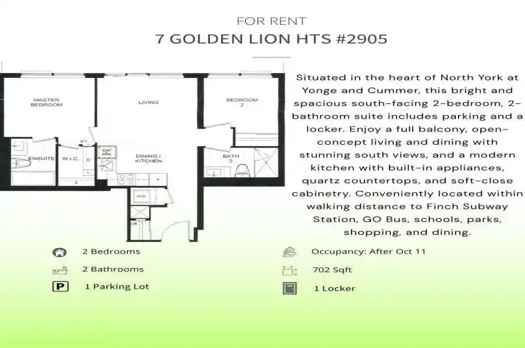 Located in prime North York at Yonge and Cummer, this south-facing 2-bedroom, 2-bathroom suite comes with parking and a storage locker. The layout is bright and spacious, featuring a full balcony. The open-concept living and dining room offers fantastic south views. The kitchen boasts luxury features, including built-in appliances, quartz countertops, and soft-close cabinetry. Walking distance to TTC Finch Subway Station and GO Bus, and close to schools, parks, restaurants, and shopping centers.