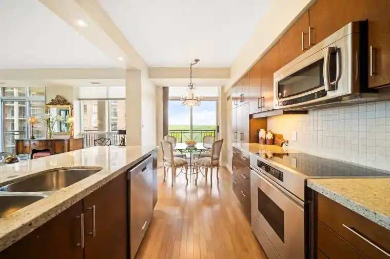 Fall in love with this outstanding light-filled Southwest corner suite w/serene views of Sunnybrook Park. Upon entering, you notice the soaring 9 ceilings, premium laminate flooring that looks & feels like hardwood & stunning park views. The highly desirable splitlayout is open concept & provides an airy feel. The beautiful & open kitchen is rarely offered in the complex & features an eat-in island, an abundance of stylish cabinetry & breakfast area. Walkout to a private oversized 162 sq.ft. balcony providing beautiful vistas that change with the seasons. The living & dining room seamlessly flow together creating an inviting place to relax or entertain guests. The suite features 2 spacious bedrooms providing privacy from one another. The primary presents picturesque views to the west, a w/i closet & 5-pc ensuite w/soaker tub & w/i shower. The 2nd bedroom which can also be a home office includes a large closet and views to the south. The 2nd 3-pc bath has a pedestal sink & glass enclosed walk-in shower. A dedicated laundry closet provides additional room to store supplies w/stacked washer & dryer. Located in the coveted community of Carrington on the Park, this suite resides in the most sought after building in the complex, the Haven, with hotel-like amenities. The building amenities include a 24-hr concierge, party room, exercise room, guest suites, visitors parking & easy underground access to indoor pool. 2 side-by-side underground parking spaces, & locker are included. An abundance of underground visitors parking conveniently located near the entry. The condo is magnificently located across from Sunnybrook Park. Over 900 acres of wooded parks, ravines, dog parks & miles of fabulous walking trails. Enjoy the welcomed convenience the variety of boutiques, bistros & amenities just moments away along Bayview Avenue, Leaside & the Shops at Don Mills. A commuters dream with easy access to the new Eglinton LRT right at your doorstep, as well as the DVP.