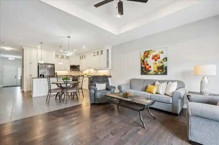 Welcome to 28 Bur Oak Drive – Bungalow townhouse with no condo fees! This lovely move-in ready townhouse offers a main floor primary bedroom, 2 car parking and is located close to shopping and amenities in Elmira. With 2,440 sq ft of total finished living space, this townhouse has 2+1 bedrooms and 3 bathrooms. Enter through the front foyer, past the front bedroom/den and the adjacent 4 piece bathroom and into the open concept kitchen and living room . The white kitchen has ample cupboard space, a large island and dinette, a great spot for your morning cup of coffee! The living room features a tray ceiling, hardwood floors and a gas fireplace. The primary bedroom has a tray ceiling, a walk-in closet and a 4 piece ensuite with shower and double sinks, no need to share your space! Also found on the main floor is the laundry room and access to the garage. Downstairs you will find an extra large rec room, an additional bedroom and a 3 piece bathroom. Have pets? This home has a pet washing station under the stairs! The backyard is a summer oasis! The fully fenced landscaped yard has a deck with pergola with built-in bench. This home is in a great location with easy access to shopping, HWY 85, and walking trails along the Lions Ring Trail.