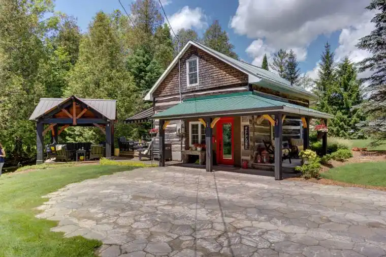 Discover the charm of this stunning century-old log cabin, beautifully set on a peaceful creekside lot. Thoughtfully renovated to blend rustic character with modern comfort, this one-of-a-kind retreat offers a warm and inviting lifestyle. The heart of the home features a custom cherry kitchen with leathered granite countertops, a live-edge wood counter in the butlers pantry, and premium Bosch appliances (2023). Heated floors in the kitchen prep area and bathroom provide everyday luxury, while the propane fireplace (serviced May 2024) creates cozy ambiance year-round. A versatile bunkie/guest house/home office, complete with its own electric fireplace and keyless entry, expands your living or work-from-home options. Step outside to enjoy the custom timber-frame pavilion with industrial-grade heat, retractable screens, and LED lighting – perfect for entertaining or relaxing by the creek. Practical upgrades include a new water heater, pump, and water softener (2022), with the septic pumped in June 2023. The professionally landscaped 0.37-acre property features a retractable awning, dusk-to-dawn driveway lighting, and propane BBQ hook-up. With 103 ft of frontage and serene creek views, this remarkable property offers the perfect balance of character, comfort, and natural beauty. A truly rare opportunity to make a log cabin retreat your year-round home.