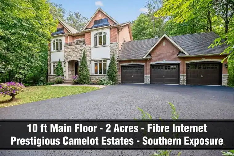Stylish & upgraded 2-Storey Estate home with 10ft main floor ceiling, 3 car garage, and fibre internet on a premium 2 acre, south-exposure lot nestled into mature forest in the prestigious Woodlands of Camelot. Experience the perfect family floor plan with a dream kitchen overlooking the family room, formal living and dining room, main floor office, four spacious bedrooms serviced with 3 baths and large main floor deck and second floor balcony. Entertain in the dream open concept kitchen with custom cabinetry, luxurious JennAir appliances, centre island and walk-out to deck. This upgraded home has been lovingly renovated over the last 2-3 years offering new sparkling oversized heated white porcelain tile flooring, upgraded staircase, fresh paint, 39 new glass panes (no more muntin bars), exquisite chef kitchen and beautifully finished decorative stucco front. The very desirable Woodlands of Camelot enclave offers 2+ acre lots carved into the forest, trails, mature trees, privacy and estate living that is conveniently located within 7 minutes from the Stouffville Go Train, 14 minutes to Hwy 404 and 20 mins to Hwy 407.