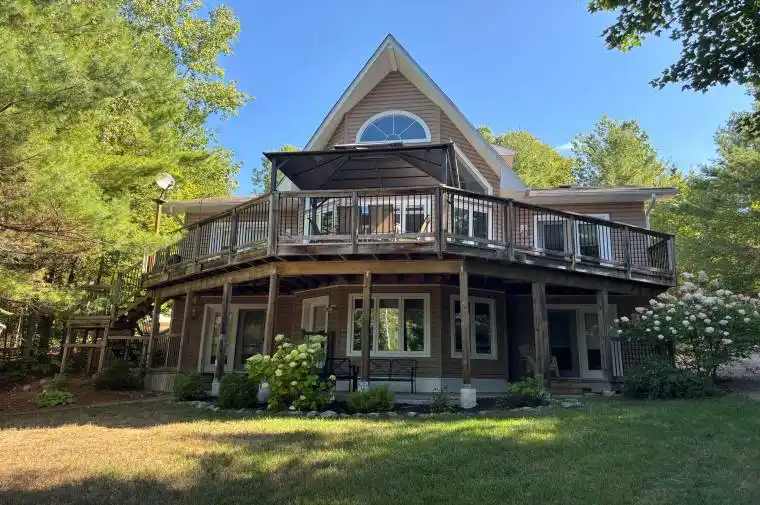 Quiet quality and thoughtful design define this 4-season, 4-bedroom home or cottage on the sought-after shores of spring-fed Carson Lake. Set on a beautifully landscaped lot, a gently sloped and terraced path leads you to a sandy beachfront complete with a dock, seating area, and convenient storage ideal for long summer days by the water. The lake itself sparkles with natural beauty and charm, offering excellent swimming, fishing, and boating. With culvert and portage access to three additional lakes, there’s always a new shoreline to explore. Step inside to find a bright and welcoming main floor, where a cathedral ceiling soars above the family room. The open-concept kitchen and dining area flow seamlessly together, all framed by a wall of windows that capture stunning lakefront views. The kitchen includes a walk-in pantry with a dedicated freezer to maximize efficiency for entertaining.The main floor also features a powder room and a spacious primary bedroom suite, complete with a walk-in closet and 4-piece ensuite. Both the primary bedroom and the main living areas offer direct access to a wraparound lakeside deck, amazing for dining, lounging, or simply soaking in the peaceful views. Downstairs, the walkout lower level offers three additional bedrooms and a relaxed living space with a built-in bar, all opening onto a lakeside patio and into the beautifully maintained backyard. From here, you’re just steps from enjoying calm, western-facing shoreline, magnificent sunsets and quiet evenings by the water.