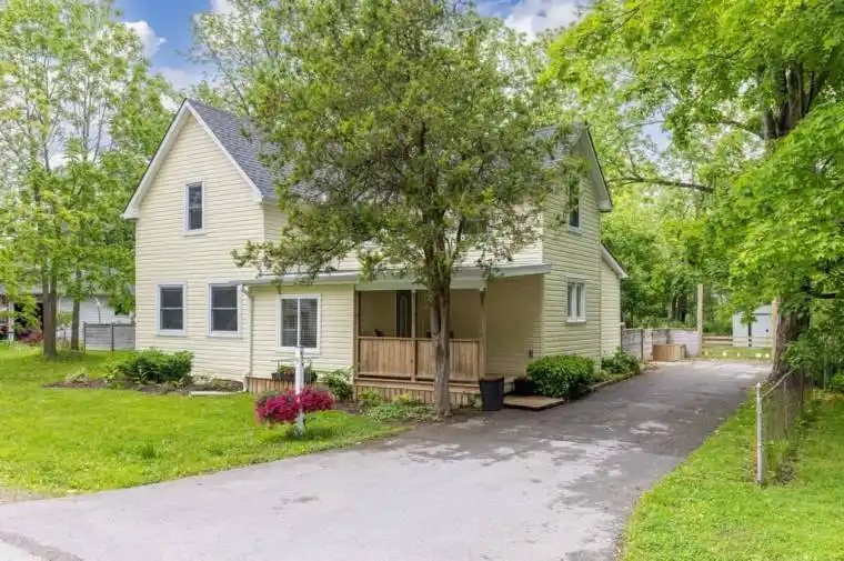 Country living, right in town! Welcome to 474 North Mill St in the heart of the quaint village of Ridgeway. This charming renovated farmhouse is sure to please with it’s main floor open concept layout on a specular double size lot. The front covered porch, with wood strapped ceiling and pot lights, is the perfect space to enjoy your front yard. Step inside to an enclosed 4 season heated rm that was once part of the covered porch (2018 renovation), and is ideal as a mud rm or office space. The bright and sunny kitchen offers plenty of cabinetry and counter space. The dining area is spacious and can accommodate the largest of family sized tables. The living rm is super nice with feature wall, open staircase to the 2nd floor, big windows to let the sunshine in and easy access through sliding doors to the backyard deck, lawns, fire-pit, and gardens. Upstairs you will find a very pretty master bdrm with closets, a good sized 2nd Bdrm with new closets, and a renovated 4 pc wshrm. Bonus main floor Laundry and mud rm is just off the kitchen as is a pretty 2 pc wshrm. A small basement houses the furnace, tankless hot water heater, and sump pump. The fenced backyard is an oasis of privacy and greenery with plenty of space for the kids, dogs, vegetable gardens, a future pool, potential Garden Suite Accessory building, or possible severance. Freshly painted, this spick and span adorable Character home is in a great location steps to the shops and restaurants of Ridgeway and Lake Erie Beaches. New Steel door with full glass between kitchen and front mudroom (2025), Hot Water on Demand (2017) Stove (2022), Built in Microwave (2022), Washer, Dryer, Paneled Refrigerator (as is), 4 new smoke detectors (2024), Sump Pump (2025), High Efficiency Furnace (2017), AC (2017), Mechanical Fresh Air Unit (2017), Garden Shed, Roof (2015). Buyer to do own due diligence regarding possible severance and or accessory garden suite.