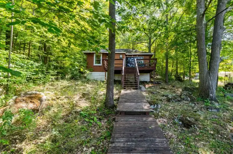 Humble, no-frills, and in a stellar spot this modest 3-bedroom, 1-bath, 3-season cottage (with shared private waterfront access) faces the Tay Shore Trail (an 18.5-km paved segment of the 28,000 km Trans Canada Trail and the longest recreational multi-use trail network in the world). Step into a simple, functional layout: an open kitchen/dining/living area flowing to the front deck, plus a wooded backyard for easy outdoor living and exploring nature. A wall heater takes the edge off cool spring and fall days. The structure sits on piers with a crawl space. A single-car garage is believed to be fully on the property. Water: the current supply is shared with a neighbouring cottage and will be disconnected before closing. The Buyer will be responsible for installing a well after closing and should complete due diligence on costs, timing, and permitting. Lifestyle bonus: included is a shared ownership interest in a nearby waterfront lot on Sturgeon Bay (off Georgian Bay), to the left of Tanners Park, accessible via a private road and just a short walk away a place to gather, launch a kayak or canoe, cast a line, swim, or play horseshoes with the family. From here, you’re about 15 minutes to Midland and roughly 30 minutes to Barrie or Orillia an easy commute to amenities while keeping that cottage-country feel. The irregular, approximately 0.34-acre parcel offers room to tinker or plan: ~48.72 frontage on Crossingview Ln, ~220.02 depth on the left, ~37.45 across the back, and ~363.68 on the right (Buyer to verify all measurements and boundaries). Keep it as a simple weekend retreat, or explore a teardown/rebuild for a future year-round home strictly subject to municipal approvals, conservation authority input (if applicable), and the Buyers own investigations. This is not the time to delay or sit on the fence. Action will reward one lucky Buyer of this rare ‘better than waterfront’ package deal.
