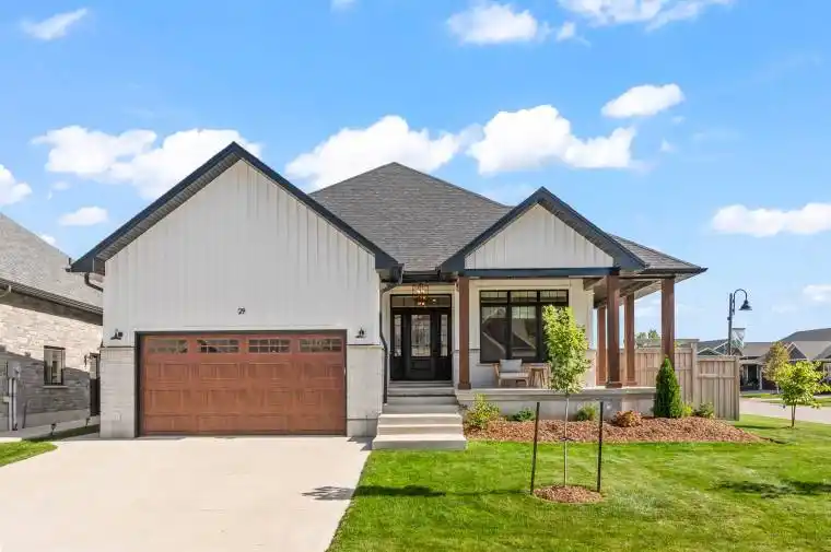 Welcome to 29 Westlinks Drive, a timeless bungalow that blends custom finishes with the lifestyle you’ve been looking for. Set on a landscaped and fully fenced corner lot with a charming wrap-around porch, this 4 year old Snyder built home offers 1,740 sqft of thoughtfully designed main floor living. Inside, the open concept layout is bright and inviting, with cathedral ceilings, a gas fireplace flanked by built-in bookcases, and expansive windows that flood the space with natural light. The living room, dining room, and primary bedroom are all equipped with mechanical blinds, adding modern convenience. The kitchen is a showpiece with custom white cabinetry to the ceiling, high-end appliances; including a gas range, a sleek black granite sink, light oak island, and seamless flow into the dining and living areas, perfect for family life and entertaining. Patio doors open to a spacious deck with room for both dining and lounging, extending your living space outdoors.The main floor features three bedrooms, each with professionally installed built-in closet organizers. The primary suite offers a spa-like ensuite with double sinks and a stunning tiled shower, while the main five-piece bath includes double sinks, quartz counters, and a tiled tub/shower combo. Light oak hardwood runs through the principal spaces. The mudroom/laundry offers custom built-ins and a bench for everyday convenience. Downstairs, the oak staircase leads to a partially finished basement with one completed bedroom and two more awaiting your finishing touches. Drywall and electrical are already in place, making it easy to create a large family or recreation area. Curb appeal is unmatched with white board-and-batten siding, stone accents, and black-trimmed windows. Life at Westlinks means more than a home, it’s a community. Your membership includes access to the golf course, tennis/pickleball courts, and a fitness center. A rare opportunity to own a custom home in a vibrant setting.