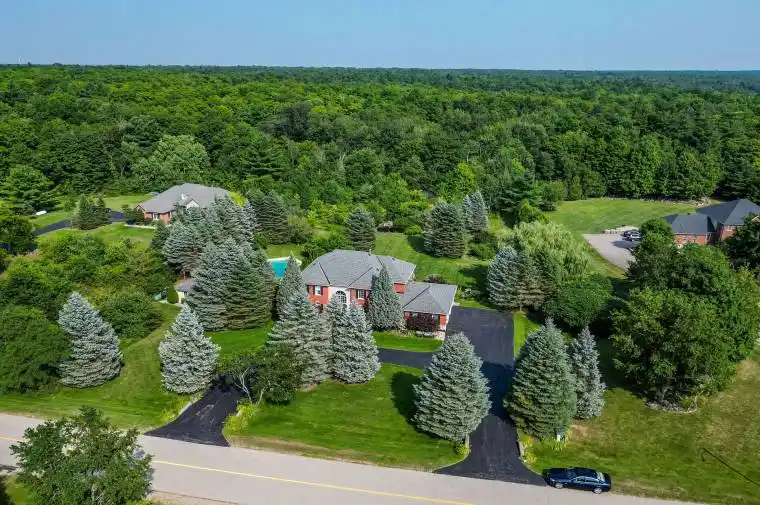 Welcome to 8 Deer Run an exceptional property in a sought-after executive estate subdivision. This private retreat sits on nearly 4 acres, including 1 acre of protected conservation. This beautifully maintained home offers approx. 3,100 sq ft above grade plus a walkout basement, combining timeless charm with modern upgrades. Perfect commuter location centrally located just minutes to Guelph, Milton, and Acton. The main floor features 9-ft ceilings, original hardwood, pot lights, crown moulding, a double-sided fireplace, and French doors opening to a coffered living room. The spacious eat-in kitchen includes granite countertops, travertine backsplash, built-in oven and cooktop, freezer, breakfast bar, walk-in pantry, and walkout to a 4-year-old deck with gas hookup and awning. A mudroom with laundry and deck access complements the 3-car garage. Upstairs offers 4 generous bedrooms, oak staircase with runner, pot lights, and original strip hardwood. The primary suite features double-door entry, fireplace, large walk-in closet, and 6-pc ensuite with Jacuzzi tub, walk-in shower, linen storage, and new toilet. Updated 4-pc main bathroom and additional linen closet complete the level. The finished walkout basement with separate entrance to the in-law suite offers 9-ft ceilings, pot lights, above-grade windows, a 3-sided fireplace, wet bar, cold room, and bedroom with stove connection and huge walk-in closet (or use as second bedroom) plus 3-pc ensuite and laminate flooring. The fenced-in 7-ft deep pool is thermal heated with a 2-year-old pump and filter. Enjoy a fully equipped pool house with running water and electricity, interlock walkway, perennial landscaping, sprinkler system, electric dog fence, surround sound, and outdoor fridge/freezer. Roof on house and pool house replaced 4 years ago with new gutters and guards. A true oasis with incredible privacy, just minutes to amenities