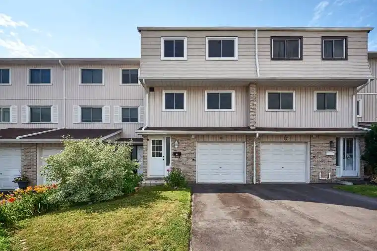 Welcome to this beautifully maintained multi-level townhome featuring a bright and spacious layout! The living room offers soaring cathedral ceilings with pot lights and a walkout to the yard, filling the space with abundant natural light. The updated kitchen showcases quartz countertops, stainless steel appliances (2022), a modern hood fan, and sleek white cabinetry. Enjoy newer laminate flooring throughout the home. The upper level offers a generous primary bedroom with dual closets and a 4-piece ensuite. The finished basement provides additional living space or storage options. Conveniently located just minutes from grocery stores, schools, restaurants, shopping, and more.**** Maintenance fees include high-speed internet and Rogers cable TV. ****
