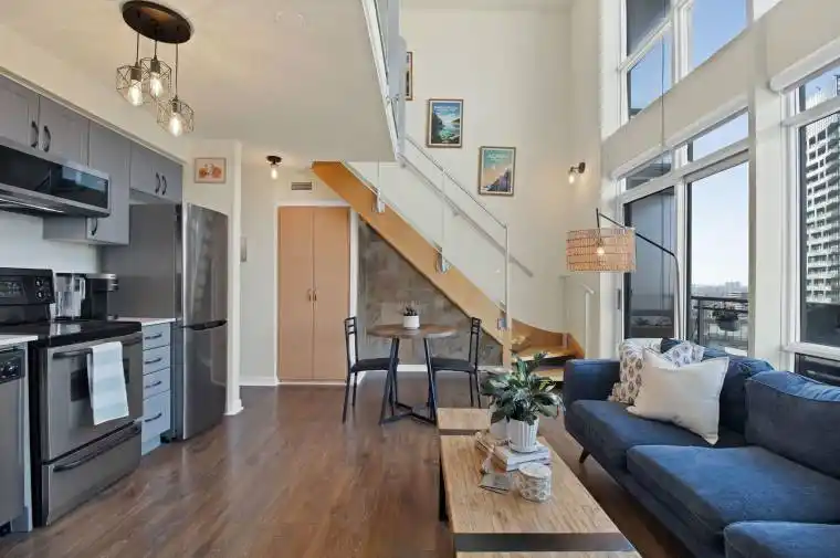 This upgraded, designer-inspired 2 bedroom with 2 bathroom urban 2 storey loft in the Waterfront Communities in Downtown Toronto is ideal for young professionals and small families seeking modern comfort, flexibility, and connection. Step inside to soaring double-height ceilings, a floating glass staircase, and floor-to-ceiling windows framing breathtaking city skyline and CN Tower views. The open-concept layout floods the space with light and creates a seamless flow from living to dining.The modern chefs kitchen features premium finishes and upgraded appliances part of the tens of thousands of dollars in updates that make this loft truly move-in ready. Enjoy morning coffee or an evening glass of wine on your private balcony overlooking the city. Upstairs, the loft-style primary suite is a bright, tranquil retreat with panoramic views, a walk-in closet, and in-suite laundry. The second bedroom is perfect for a child, guest, or dedicated home office. With top tier managers that keeps maintenance fees low for this building, you will also enjoy resort-style amenities including a fully equipped gym, indoor pool, hot tub, sauna, basketball court, games room, outdoor BBQ terrace, and a 27th-floor party lounge with skyline views. The on-site business centre gives you the perfect SECOND OFFICE ideal for meetings, calls, or quiet productivity away from home. A children’s PLAYROOM allows for extra space for your children to enjoy and concierge service add even more security. LOCKER and SECOND PARKING rental option is available. Located steps to Sobeys, The Well, Financial District, King West Dining, Entertainment District, Rogers Centre, Waterfront trails, Canoe Landing Recreation Centre, Playground, Parks, Lake Ontario, and Union Station, with streetcar access at your door. Includes one owned parking space.Tens of thousands in upgrades. Flexible live/work design. Unmatched amenities.If you’ve been waiting for a downtown home that fits your lifestyle this is THE ONE for you!