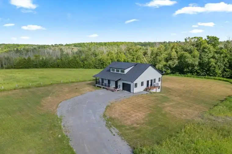 Stylish, spacious, and just a few years young, this quality-built bungaloft offers the perfect blend of modern comfort and country charm. Set on 2 acres, it features open-concept living, vinyl flooring throughout, and tons of natural light from the many windows. The main floor includes a bright kitchen, dining and living area, mudroom with laundry, and a versatile second bedroom with a separate entrance. The primary bedroom is thoughtfully designed with a walk-in closet, 4pc ensuite, and cozy heated floors. Upstairs, you’ll find two additional bedrooms and a 4pc washroom, perfect for family or additional guests. The walk-out basement offers endless potential with above-grade windows and rough-ins for a bathroom and kitchenette.