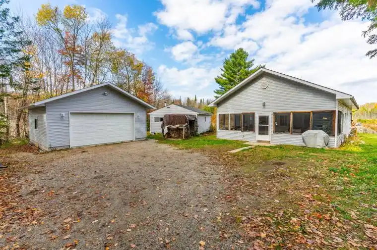 PRIVATE COUNTRY BUNGALOW ON 33 ACRES WITH POND. Tucked away on 33 acres of peaceful privacy, this inviting one-level bungalow offers a quiet country lifestyle just 7 minutes to the town of Minden and all amenities. Enjoy the best of both worlds; a private natural setting with easy access to shops, restaurants, and several public beach access points only minutes away. Inside, you’ll find 1,075 sq. ft. of practical living space with an open-concept kitchen and family room. The kitchen’s large island makes a great spot for gathering, while the cathedral ceiling and woodstove add warmth and character to the main living area.There are three bedrooms, including a 2-piece ensuite and a 4-piece main bath. Both back bedrooms have walkouts to a screened-in porch that spans the entire back of the home; the perfect place to enjoy a morning coffee or quiet evening surrounded by nature. A second screened-in porch runs along the front, offering even more space to relax and take in the peaceful surroundings. Outside, the property is a nature lovers dream. Explore your private pond, wander the acreage, or simply sit and listen to the sounds of the woods. A newly built 24×24 detached garage (2023) provides excellent storage for vehicles, tools, or recreational equipment. With a drilled well, septic system, and forced air propane furnace, this home is set up for comfortable year-round living. Whether you’re looking for a quiet country residence or a weekend retreat, this property offers a relaxed, natural lifestyle surrounded by the beauty of Haliburton County.