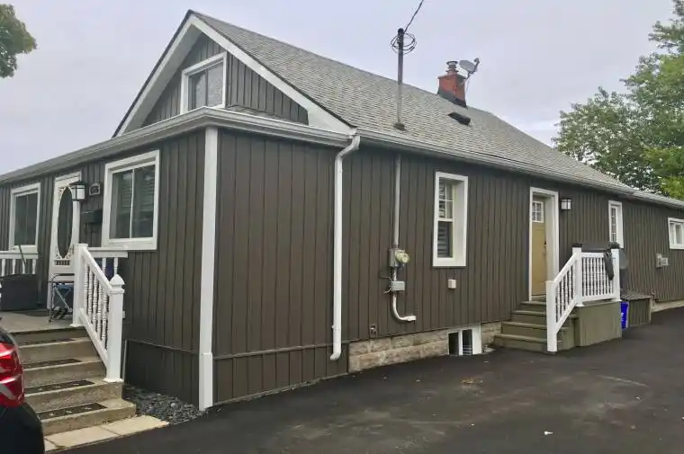 A Little Country in the City! Renovated BUNGALOFT with TWO Bedrooms on the Main Floor and another Larger Bedroom with Walk in Closet and dressing area Upstairs. The upper bedroom can also be used as a Family Room, Den or Guest Bedroom. Currently the two main floor bedrooms are just being used for office and storage. Lovely Mohagany Kitchen with plenty of cabinets, extended countertops and built in pantry. Gas stove for the chef in your family who loves to cook and a Built in Dishwasher helps cleanup. Colonial Doors and Trim, High Ceilings, Custom Blinds and Pot lights modernize this well lit space. Main Floor Laundry is conveniently built right into the Bathroom and this home includes Central Air Conditioning and has efficient Gas Forced Air Heat. Tenants space is the about 2/3 of the total square footage and Tenant Pays 2/3 of utilities as shared with a single owner – lives in separate attached (semi like) unit at rear. Paved Parking and Exterior Maintenance , Grass Cutting and Snow Shovelling are all included in the Rental. Your own Bungaloft home and yard without the maintenance and upkeep of a house