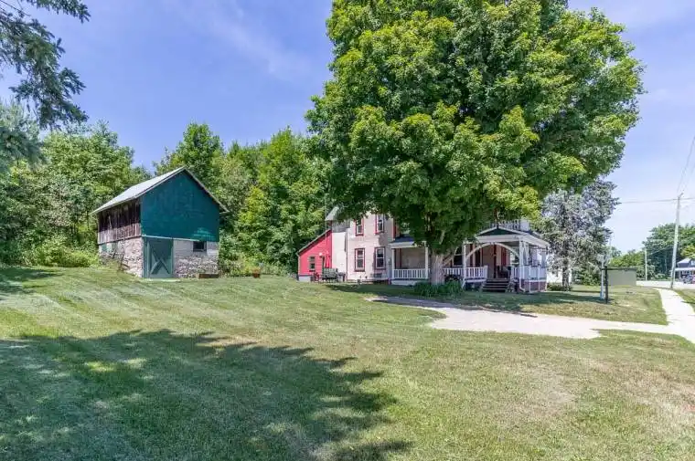 Welcome to the Davenport House. This beautiful century custom builders home will call you with it’s unique custom finishes. The wrap around covered porch, original craftsman front door with stained glass. Custom wood work staircase, balusters and under staircase storage wood panels. Crown molding, 9 inch baseboards and wood detail custom ceiling. Classic century style with 2 separate stair cases. Kitchen offers the original Tin ceiling a walkout to side deck and a back 3 season den and enclosed storage room and back staircase to the upper level. Pantry/laundry room off kitchen. Separate dining room and living room. Main floor generous sized bathroom in addition to the upstairs full bathroom. Upper sunroom with walkout to the balcony. This home offers 3 upper bedrooms. This is an extremely well maintained century home. Updated gas hot water tank, updated copper electrical 200 amp breaker panel. Updated plumbing, basement walls have spray foam insulation and new septic. All exterior walls have been insulated. Most windows are updated, roof in in good condition. Heating cost is very efficient with the concrete exterior walls and added insulation. Outdoor structure a detached smaller barn and garden shed. Close hwy access 15 min from Barrie. Located across the road from a park. Close to skiing, golf, hiking and snowmobiling.