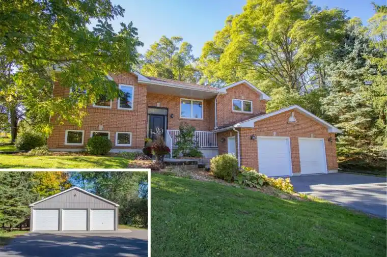 Within walking distance to Rice Lake, Gore’s Landing Park & Marina, this beautiful brick 3+1 bedroom raised bungalow on a 1/2 + acre lot (.63) has exceptional curb appeal, offering a perfect blend of tranquility and convenience for outdoor enthusiasts and families alike. As you approach 5176 Kelly Rd, you will notice the extensive paved driveway (4 yrs) with parking for lots of vehicles and toys. Attached to the home is an over-sized double garage with direct access to the lower level offering potential for an in-law suite, a convenient ramp for easy accessibility (removable) and wired for portable generator hookup. In addition, there is a detached vinyl sided 3-car garage (24’7 x 30′) built in 2016 that is heated, insulated, 100 amp service and has a concrete floor, making this an ideal space for hobbyists, car enthusiasts and/or additional storage. Step inside the home to discover a bright main level featuring interior renovations in 2017/18 with maintenance-free Andersen windows, hardwood flooring, crown mouldings, white colonial doors and baseboards. The heart of the home is the family-sized kitchen, complete with white cabinetry, stainless steel appliances, and a spacious eating area with extra matching cabinet, in addition to a garden door walkout to yard. Entertain in the front living and dining area with 3 large windows overlooking the front garden and yard. The primary suite offers a modern 4-piece ensuite and walk-in closet, plus there are 2 additional main floor secondary bedrooms with a 3-piece washroom incorporating a stackable washer and dryer, large shower with sliding glass doors plus vanity area. The lower level presents more bright living space with a 4th bedroom, huge L-shaped recreation room warmed by a cozy propane fireplace, 3 front elevation above-grade windows, rich coloured laminate flooring, and a suspended ceiling with pot lights, plus multiple unfinished utility rooms.