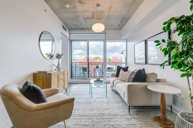 Bright, airy, and impeccably designed. This loft at The Carlaw offers two generous bedrooms, two full bathrooms, and a den that can serve as a dedicated home office or flex space. It’s perfectly suited for modern living with 9-foot exposed concrete ceilings, floor-to-ceiling windows, and a north-facing balcony with a gas hookup. The open-concept layout is ideal for both entertaining and daily comfort. The upgraded kitchen features quartz countertops, extended cabinetry, and full-size stainless steel appliances, all finished in a contemporary palette. Hardwood flooring flows seamlessly throughout the space. The locker is conveniently located on the same floor as the unit. Building amenities include a rooftop terrace with a picture-perfect City Skyline View, a fully equipped gym, a party room, and a 24-hour concierge. This loft offers a rare blend of effortless living in the East End, with Crows Theatre and the newly opened Piano Piano just downstairs. The best of Leslieville’s shops, cafes, parks, and transit are within steps. Don’t miss out on this incredible opportunity. Welcome home.