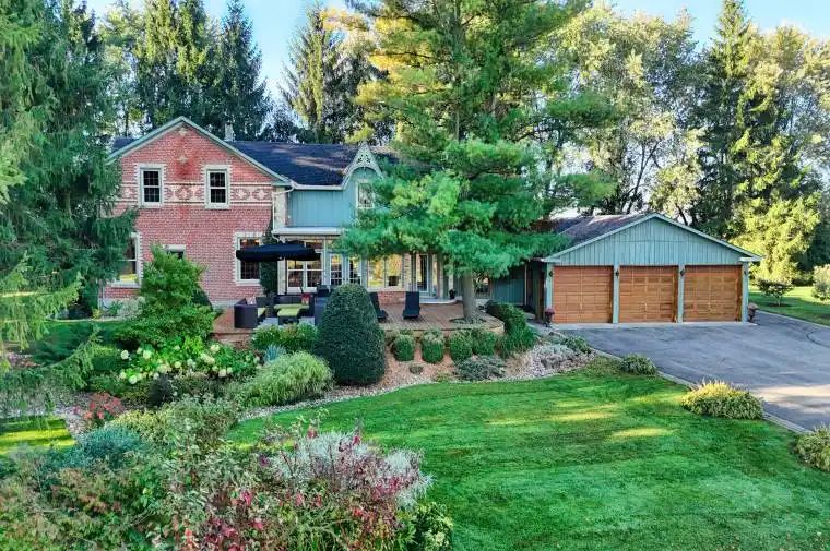 Visit REALTOR website for additional information. A once-in-a-generation opportunity awaits with this extraordinary century home, offered for the first time since 1978. Nestled along the Speed River on 69.19 acres of complete privacy, this property offers tranquility and space rarely found today. A picturesque 750m tree-lined drive leads to the residence, set well back from the road with paved parking for up to 10 vehicles. The main home offers nearly 3,874 sq. ft. of living space plus a separate in-law suite behind the triple car garage. Inside, 10-foot ceilings (9′ in the kitchen) and original exposed brick bring charm and character. The bright, eat-in kitchen features extensive windows and French doors opening to a sprawling east-facing deck (884 sg. ft.) shaded by mature trees. A second, west-facing deck (486 sq. ft.) offers more outdoor living space and an outdoor shower, accessible from both the kitchen and the cozy fireplace room. The main level also includes formal living and dining rooms, a powder room, a large mudroom, and a unique two-story bonus space ideal for a home office or gym. Upstairs are three or four bedrooms, including a flexible primary suite with a massive walk-in closet, dressing room, and private 25′ * 7′ deck. A large bathroom and upper-level laundry complete the second floor. The attached triple garage includes a spacious 623 sq. ft. in-law suite with kitchen, living room, 3-piece bath, and loft bedroom. A detached, heated 30′ x 40′ shop with running water provides excellent storage for equipment or hobbies, with ample additional parking for trailers or toys. With approximately 33 acres of productive farmland and forested acreage along the river, this property offers endless possibilities. Bonus income from land and apartment rentals-totaling $29,500 annually -helps offset expenses, making this an exceptional and rare offering.