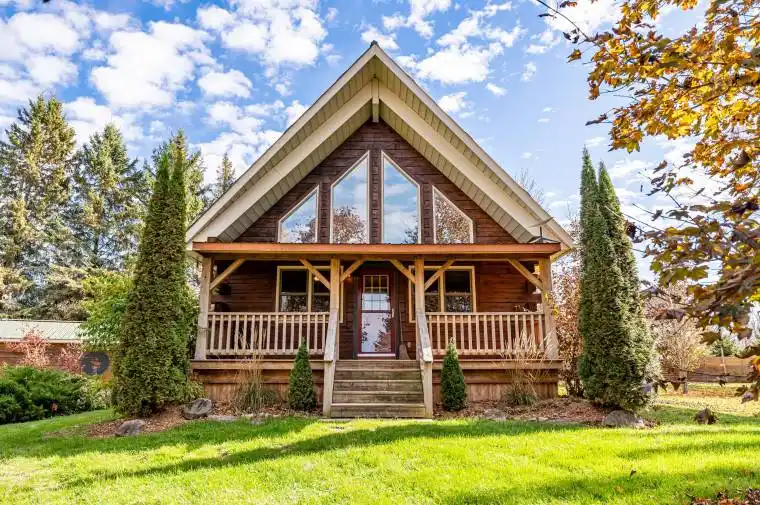 Welcome to a home that feels like it was made just for you. Tucked away in the cherished “Glen” community with peaceful lake views, this hand crafted log bungaloft captures the essence of warmth, character, and connection to nature. Sunlight fills the open living and dining space, where vaulted ceilings, exposed beams, and a glowing gas fireplace invite you to slow down and savour each moment. Upstairs, the loft-style primary bedroom offers a breathtaking view of the lake through a frame of crimson maples, a view that never gets old. The kitchen is both beautiful and practical, with quartz countertops, a walk-in pantry, and a bright mudroom that keeps life organized. Evenings are made for gathering by the fire, soaking in the covered hot tub, or enjoying a quiet paddle on the lake. A heated, detached workshop with power is perfect for creative projects. Every detail here has been lovingly cared for. This isn’t just a home, it’s a feeling, and we invite you to experience it for yourself!