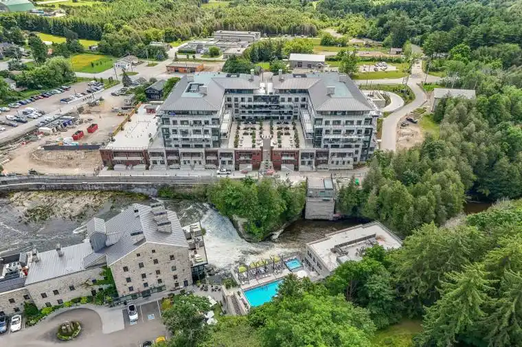 Luxury Living in the Heart of Elora! Welcome to the Fraser model at the exclusive Elora Mill Condominiums -opportunity to own a stunning 3rd-floor suite in one of Ontario’s most charming and sought-after communities. This west-facing residence offers an inspiring view framed by mature cedars, with a tranquil peek at the Grand River, all from the comfort of your living room. Featuring designer-selected finishes, 10-foot ceilings, expansive windows, and an open-concept layout, this suite delivers effortless elegance. The kitchen is accented with premium cabinetry, quartz countertops, and built in appliances perfect for entertaining or quiet evenings at home. Designed with clean architectural lines, the space flows from a central living area to a private balcony ideal for morning coffee or sunset views. The bedroom offers private views, patio access, and ensuite. Den is perfect for home office or last minute guest as full bathroom is nearby. The unit has full access to main floor lounge, outdoor terrace, outdoor pool/sun deck, gym and yoga space, concierge, coffee/cafe in main lobby, dog wash/grooming station and access to trails. Unit 304includes 1 indoor parking space with plug for EV and storage locker. Enjoy living in the historic village of Elora with access to shops, cafes and restaurants. Whether you’re downsizing in style or investing inresort-style luxury, the Fraser model blends boutique condo living with small-town charm. Immediate possession available.