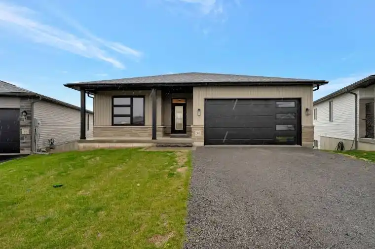 Welcome to this beautifully designed new bungalow, perfectly positioned in a quiet neighbourhood just minutes from Frankford. Thoughtfully crafted with modern finishes and open-concept living, this home offers 3 spacious bedrooms plus a den/office, ideal for today’s lifestyles. The bright, contemporary kitchen features abundant cabinetry, quartz countertops, and a large island, flowing seamlessly into the dining area and great room-perfect for entertaining or family gatherings. Step out from the great room onto the expansive deck with a BBQ outlet, where you can enjoy panoramic views of the subdivision and the rolling hills leading toward the Trent-Severn Waterway. The primary suite provides a private retreat with a walk-in glass and ceramic shower in the ensuite, while the main bathroom is stylishly appointed for guests and family alike. The home show cases laminate flooring throughout and elegant hardwood stairs, with carpet only in the lower-level bedroom for added comfort. The fully finished lower level offers excellent in-law suite potential, featuring a spacious rec room with a modern tile-surround fireplace, a wet bar complete with a fridge opening, a fourth bedroom, and a 3-piece bathroom. The walkout basement leads to a beautiful interlocking patio, creating a comfortable and independent living space for extended family or guests. Bright and airy with abundance of windows, this home combines modern craftsmanship, comfort, and stunning natural surroundings-all within easy reach of Frankford’s amenities, parks, and the Trent River.