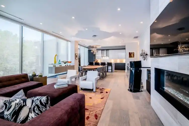 Stunningly beautiful and rarely offered, this spacious two-storey suite in one of Yorkvilles most coveted boutique residences is the perfect urban retreat. Offering over 2,100 square feet of light-filled living space, this 2+1 bedroom, 3 bathroom home with a wrap around terrace is ideal as a sophisticated pied-à-terre or for those looking to downsize without compromise. The main floor is designed for elegant living and effortless entertaining. It features an expansive open-concept layout with a generous foyer, stylish powder room, and a seamless flow between the living room, dining area, and oversized kitchen. The living room is anchored by a gas fireplace with a feature wall, flanked by sleek glass shelving and custom lower cabinetry. From here, step out onto a private balcony – perfect for morning coffee or evening cocktails. The chef’s kitchen is outfitted with built-in Miele appliances, Caesarstone countertops, a large centre island, and custom cabinet organizers, making it as functional as it is stylish. Hardwood floors run throughout, while floor-to-ceiling, wall-to-wall windows with Lutron motorized shades provide beautiful natural light on both levels. The lower level offers a well-considered private retreat with two bedrooms plus a den/office, and direct access to the wraparound terrace – ideal for hosting gatherings of up to 60 guests. The primary suite features a walk-in closet with built-ins, ensuite laundry, and a spa-inspired 5-piece ensuite with heated floors, a deep soaker tub, oversized shower with steam sauna, double vanity with Caesarstone counters, and a private water closet. The second bedroom includes its own 3-piece ensuite – perfect for guests – while the open concept den/office area includes custom built-in shelving, ideal for working from home or additional storage. This suite comes with 2 Parking Spaces, 1 Locker + 1 Wine Cellar/Locker.