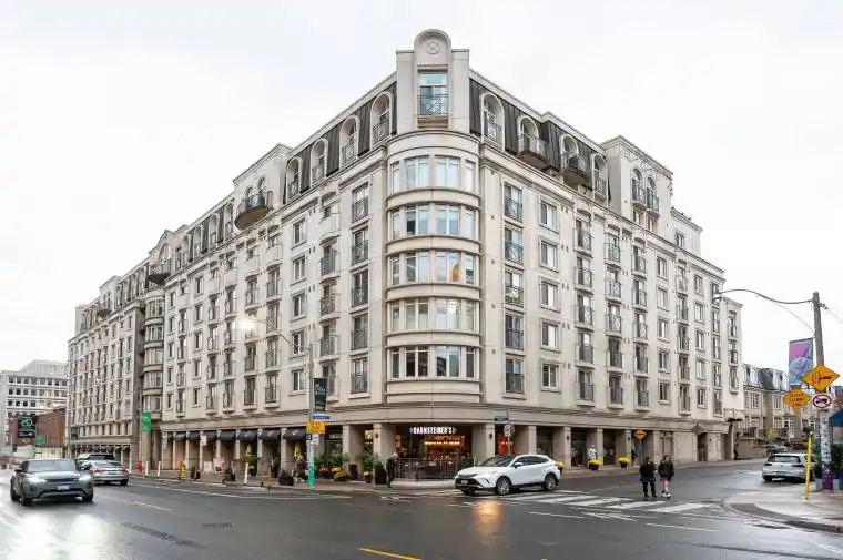 Distinctly, One of One. Suite 803 is a sub-penthouse that offers all the hallmarks of fine living. 9-foot smooth ceilings throughout accented by crown mouldings, gallery-quality wall space, and floor-to-ceiling French doors that flood every living space with natural light through custom Hunter Douglas blinds. Hardwood flooring and solid wood Shaker doors throughout exude quality.The inviting foyer leads to the open concept living and dining rooms and a Chef-inspired kitchen with exquisite marble counters and curated appliances. The expansive primary bedroom easily supports a king-sized suite of furniture and features 3 double built-in custom closets. A sumptuous 4-piece primary ensuite features a mosaic tile floor, a large shower enclosure and classic double vanity with marble top. The spacious and inviting 2nd bedroom has a large double closet and could serve as your home office and den. The luxury continues with the main bath featuring an immersion tub with a rain shower, a large vanity and additional storage cabinet. All 6 floor-to-ceiling French doors provide access to 3 balconies that wrap this beautiful corner suite. This extraordinary living space comes with 2 deeded parking spaces that are just steps from a large, exclusive use locker. 1 Balmoral Avenue is a mid-rise building of only 133 suites with impeccable property management, a dedicated, long-serving Concierge team and support staff. 40 visitor parking spaces and 2 guest suites ensure your guests are comfortably accommodated. *Status Certificate is available*.