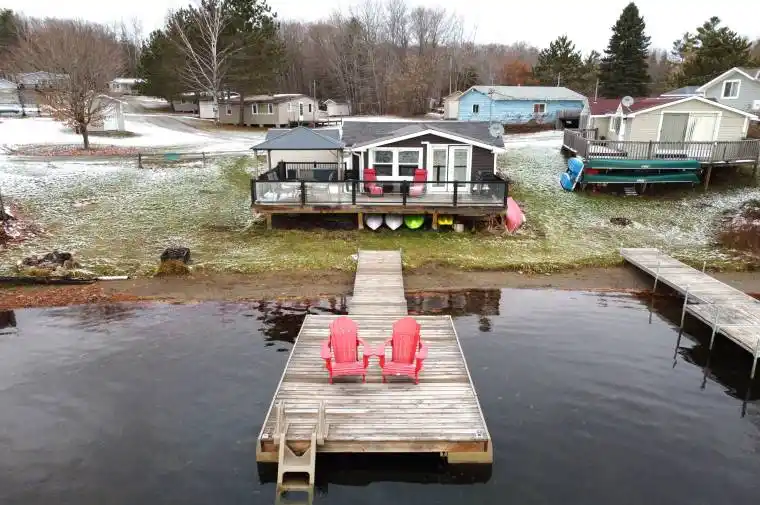 Discover the perfect retreat in this charming, fully renovated 2-bedroom, four-season cottage nestled within a well-maintained co-operative community. Ideally positioned along the shores of South Lake, this cozy getaway offers stunning southern lake views right from your expansive private deck. Enjoy direct access to the water from the convenience of your own backyard, or take a refreshing swim from the hard, sandy shoreline. The private dock provides added convenience for you to access your boat/watercraft with ease! Ownership of the cottage provides year-round enjoyment, with shared amenities that include boat launch, beach area, playground, in-ground pool, and boat slips. The annual maintenance fee conveniently covers taxes, insurance, grounds maintenance, water, sewer, garbage, and road plowing, allowing you to relax and enjoy carefree cottage living. Upgrades include a newer roof, siding, deck, plumbing, wiring, kitchen, flooring, heating/AC, and full spray-foam insulation throughout. An affordable and appealing option for full-time cottage living with excellent rental potential, this lakeside escape is ready for you to move in and unwind.