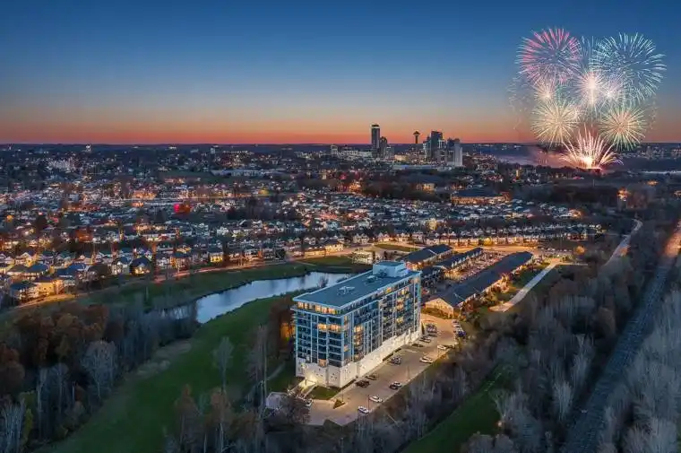 Welcome to Upper Vista Niagara, an exclusive sub-penthouse residence overlooking the pristine fairways of Thundering Waters Golf Club. This rare 2 bedroom, 2 bathroom plus den suite offers 1,502 square feet of refined living space with two private balconies that capture uninterrupted views of the golf course, peaceful ponds and the Niagara Falls skyline. Step inside to an airy, contemporary layout framed by 10 foot ceilings and expansive floor to ceiling windows that fill the home with natural light. The gourmet kitchen features sleek cabinetry, quartz countertops, stainless steel appliances and a generous island designed for effortless entertaining. The primary suite offers balcony access, a walk-in closet and a spa inspired 5-piece ensuite. The additional bedroom and spacious den provide flexible options for guests, a home office or a quiet retreat. Enjoy premium building amenities including concierge services, underground parking, a private locker, a state of the art gym, yoga studio, theatre room and beautifully designed common areas. This peaceful, tree lined setting feels worlds away, yet sits moments from world class attractions, dining, casinos, shopping, nature trails and the U.S. border. Experience luxury condo living surrounded by nature with exclusive views of the Falls and nightly fireworks. This suite delivers an elevated lifestyle in one of Niagara’s most desirable boutique buildings.