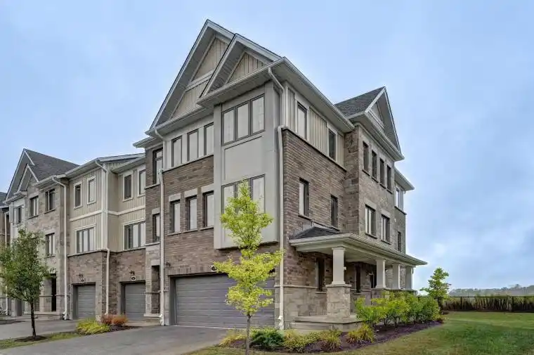 A Modern End-Unit Townhome with Ravine Views & 2-Car Garage. Includes THREE MONTHS OF FREE maintenance fees for added saving. Perfect for couples, young families, or professionals. Why choose between form and function? This home offers both with an open layout, large windows, and modern black-and-white finishes. The master bedroom and deck overlook a beautiful ravine, while a flexible upstairs living space can double as a family room, office, or play area. Stainless steel appliances complete the upgraded interior. Centrally located near the highway for easy GTA commuting. Condo fee includes high-speed internet ($100 value), lawn care, landscaping, snow removal, gutter cleaning, exterior window cleaning, fixture repair, and structural deck maintenance. With modern finishes, scenic views, and hassle-free upkeep, this end-unit townhome combines comfort, convenience, and style in one complete package.