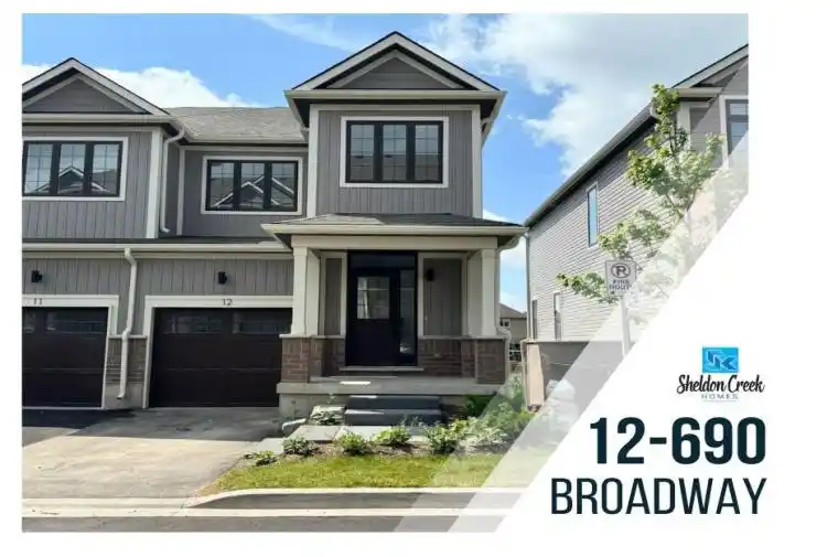 Purchase directly from the builder and become the first owner of 12-690 Broadway, a brand new townhouse by Sheldon Creek Homes. This modern, 2-storey end-unit is move-in ready and features a finished walk-out basement and a spacious backyard. Step inside to a beautifully designed main floor with high-end finishes including with quartz countertops, white shaker kitchen cabinetry, luxury vinyl plank flooring, and 9′ ceilings on the main floor. Enjoy the outdoors on a generous 17′ by 10′ back deck. Upstairs you will find a large primary suite with a 3-piece ensuite and large walk-in closet, along with two additional bedrooms and a 4-piece main bath. The 690 Broadway Community is a beautiful and vibrant space with a parkette, access to local trails, visitor parking and green space behind. 7 Year Tarion Warranty, plus A/C, paved driveway, & limited lifetime shingles.