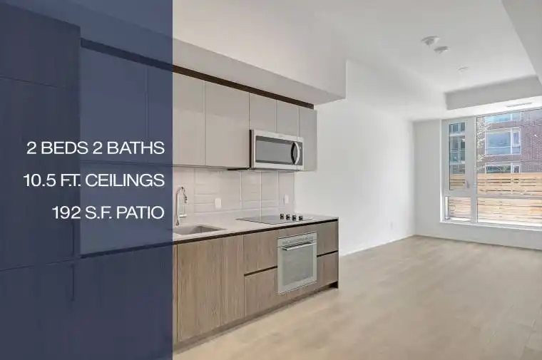 This bright and well-designed 2-bedroom, 2-bathroom Wonder Condos unit offers 705 sq. ft. + 192 sq. ft. private patio. Found in Toronto’s South Riverdale & Leslieville area. The functional layout features 9-foot ceilings and laminate flooring throughout. The living room is enhanced by large windows, offering a comfortable and inviting space. The L-shaped kitchen, combined with the dining room, includes stone countertops and integrated appliances: fridge, dishwasher, cooktop, and built-in oven and microwave. The primary bedroom features walk-out access to the patio, a 4-piece ensuite, floor-to-ceiling windows, and a closet. The second bedroom is in a split bedroom layout with glass swing doors and a closet, offering excellent flexibility as a guest room or office. The rare ground-level patio provides a peaceful outdoor escape with direct access from both the living room and primary bedroom. Residents enjoy access to excellent amenities, including a gym, co-working library, pet wash station, visitor parking, kids’ playroom, partyroom, and rooftop terrace, all within a boutique building seamlessly integrated into the historic Wonder Bread Factory. Steps from Queen Street East, Jimmy Simpson Park, cafes, restaurants, and only minutes to the waterfront, DVP, and downtown core.