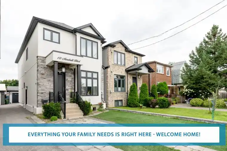 Welcome to 10 Marshall Blvd, a stunning 4-bedroom, 3-bath detached home nestled in the heart of Toronto’s vibrant Mount Dennis Rockcliffe-Smythe community. This recently built gem offers a perfect blend of modern elegance and family-friendly comfort, spanning over 2,500 sq ft, inclusive of all three floors. Step inside to soaring 10-ft ceilings on the main floor, where natural light pours through oversized windows, illuminating rich hardwood floors and a striking open layout. The chef’s kitchen is a showstopper, complete with a quartz island, three-level stacked cabinetry reaching the 10-foot ceilings, and a vast breakfast bar perfect for casual mornings or evening entertaining. Step upstairs and enjoy 9-ft ceilings over four spacious bedrooms, including a luxurious primary suite with a spa-inspired 5-piece ensuite and custom walk-in closet. The fully finished basement offers a separate entrance, dedicated laundry room, laminate flooring and LED lighting, just perfect for extended family or rental potential. Outside, a private backyard patio to enjoy weekend family breakfasts again, then host weekend BBQs and quiet relaxation evenings. Located in a peaceful, family-oriented neighbourhood, 10 Marshall Blvd is ideal for an active lifestyle, just minutes from the Humber River trails, Tennis Parks, and Lambton Golf & Country Club. Families will appreciate proximity to top-rated schools (including Francophone), visit community centres, and playgrounds. Commuters benefit from easy access to TTC, the recently opened Mount Dennis LRT – GO/UP Express, and major highways. Enjoy nearby shopping at Stockyards District, local cafés, and diverse dining options that reflect the area’s multicultural charm. This is more than a home-it’s a lifestyle. Whether you’re raising a family, working remotely, or entertaining guests, 10 Marshall Blvd offers the space, style, and location for your family to grow and celebrate life’s moments.