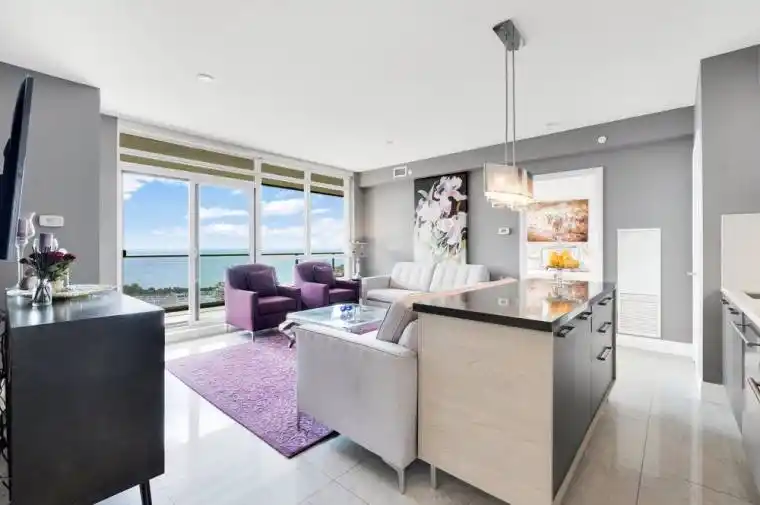 *Month-to-Month Lease. Fully furnished, turnkey corner suite in Mimico-Humber Bay with floor-to-ceiling windows and sweeping southwest views of Lake Ontario, the city skyline, and sunset skies. Hydro included, subject to reasonable usage. *Originally constructed as a two-bedroom layout, the second bedroom was professionally converted by the builder into a dining room. The space is not configured as a bedroom and is offered for use as a dining area, perfectly suited for entertaining, working dinners, or a refined home setup. The suite is fully furnished and fully equipped, including complete kitchenware and a premium coffee setup. Curated furnishings blend vintage and contemporary design, complemented by porcelain flooring throughout, stone countertops with matching backsplash, and designer lighting. The primary bedroom offers water views and a walk-in closet. A spacious balcony overlooks the lake and sky. Two-zone HVAC ensures comfort throughout the suite. Steps to the waterfront, trails, cafés, restaurants, grocery stores, LCBO, Shoppers Drug Mart, Mimico GO Station, and quick access to the Gardiner, QEW, Hwy 427, and Pearson Airport. Simply bring personal belongings and settle in. Hydro included, subject to reasonable usage.