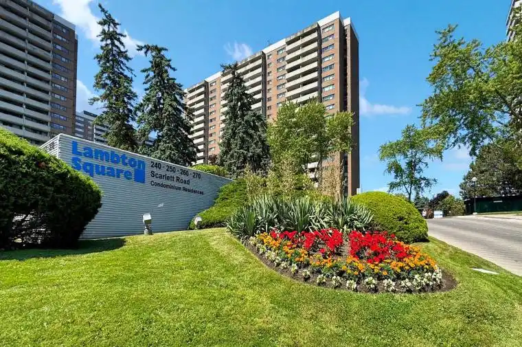 Nestled in the scenic Rockcliffe-Smythe neighborhood, this charming 2-bedroom, 2-bathroom condo in Lambton Square offers both comfort and character. The unit features a unique sunken living room that adds architectural flair and coziness, while the oversized balcony provides breathtaking unobstructed northeast views, perfect for morning coffee or unwinding in the evening. Ample storage throughout, plus a dedicated locker and parking spot, make everyday living effortlessly organized. In this pet-friendly (w restrictions) building, all-inclusive maintenance fees cover everything from cable and internet to access to top-tier amenities like a gym, outdoor pool with sauna, party room, and plenty of visitor parking. With beautifully landscaped grounds backing onto the tranquil Humber River, it’s a hidden gem that blends urban convenience with natural serenity. Locker is 3ft by 7 ft. One bus to Runnymede Station!