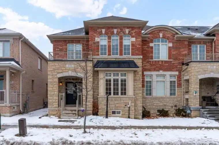 Welcome to 173 Etheridge Avenue, a refined brick-and-stone townhome offering exceptional space, comfort, and versatility in a desirable Milton community. A stately double-door entrance welcomes you home, complemented by ample visitor/street parking directly outside or added convenience.Inside, a bright foyer with 9-foot ceilings leads to an open-concept main floor where the living and dining areas are accented by elegant wainscoting and flow seamlessly into a spacious family room with a cozy gas fireplace. The kitchen is thoughtfully designed with quartz countertops, a stylish backsplash, an undermount sink, gas stove/oven combo with exhaust hood, and a generous breakfast area-ideal for both everyday living and entertaining. Laminate flooring enhances the living spaces, while ceramic tile finishes the kitchen, breakfast area, and powder room. A private backyard leading to the detached double-car garage completes the main level.The second floor offers three well-appointed bedrooms with laminate flooring, windows, closets, and blinds throughout. A convenient laundry room with tub and window adds everyday ease, while the primary suite features a walk-in closet and a bright ensuite with a large walk-in shower, double sinks, and a window. A well-designed main bathroom serves the additional bedrooms.The finished basement provides impressive additional living space with an open-concept recreation area, pot lighting, laminate flooring, and windows. A bedroom and full bathroom create flexibility for guests or extended family, while ample storage, two cold rooms, and existing rough-ins for a future kitchenette add long-term value.