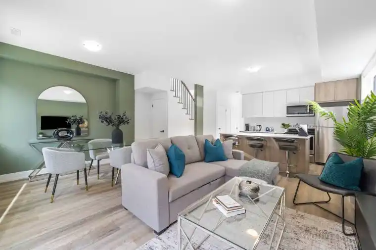 A fully-furnished, bright and modern laneway home in the heart of Roncesvalles. This well-laid-out 3-bedroom, 3-bathroom unit offers 1,274 sq ft of living space over two levels.The main floor features an open-concept living and dining area with laminate flooring, connected to a modern kitchen with stainless steel appliances, a centre island, and backsplash. Ensuite laundry is included.All three bedrooms are located on the second floor for added privacy. The primary bedroom features a walk-in closet and 3-piece ensuite. A second 3-piece bathroom serves the remaining bedrooms, with an additional 3-piece bathroom on the main floor.The unit includes one parking space. Located steps from Roncesvalles shops, cafés, and restaurants, with easy access to TTC, Bloor GO Station, Dufferin Mall, High Park, grocery stores, and specialty markets. Short-term rental options available.